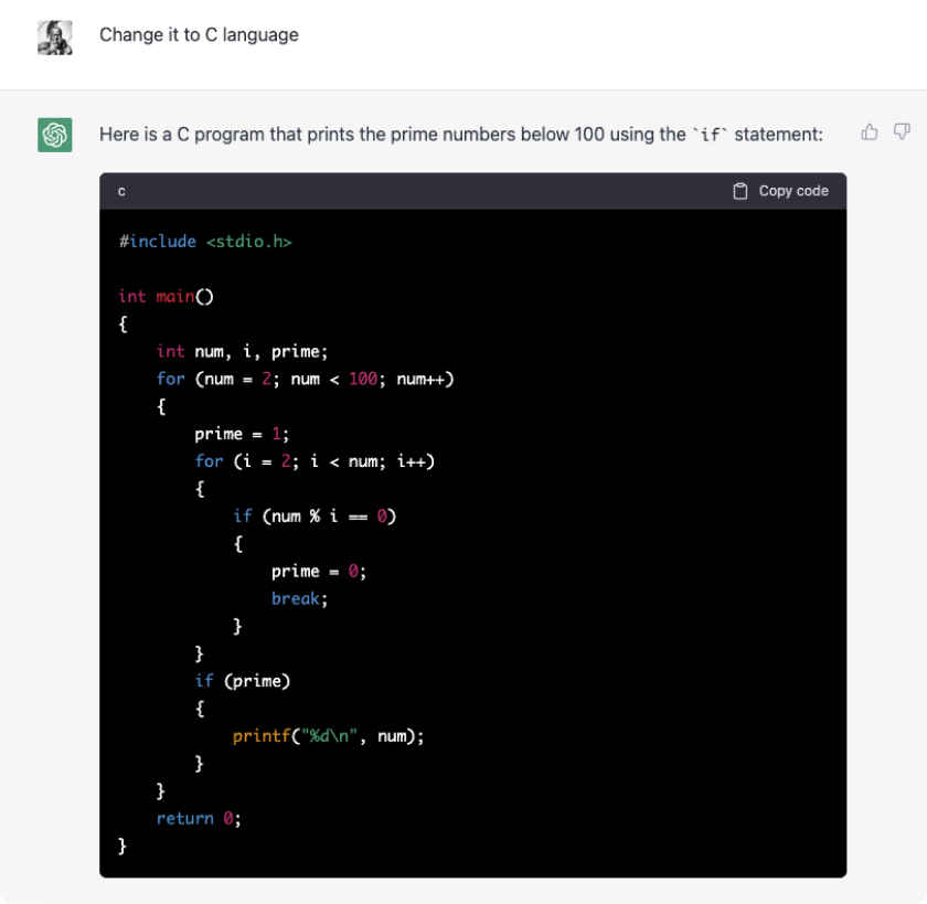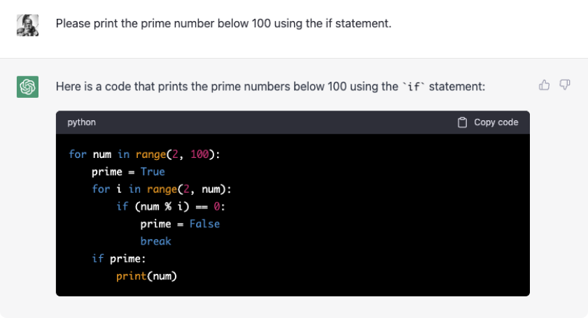 챗GPT로 코드도 짤 수 있습니다. 간단한 코드로 예를 들어보겠습니다. if 문을 사용해서 100 이하의 소수를 출력하는 코드를 작성해 달라고 했습니다.