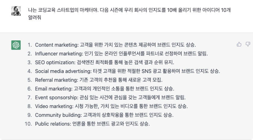 그럼 이제 본격적으로 챗GPT에게 일을 시켜볼까요. 챗GPT를 사용하면 업무 효율성을 대폭 올릴 수 있습니다. 몇 가지 예시를 보여드릴게요. 다음 시즌 마케팅 캠페인을 위한 아이디어 브레인스토밍을 시켜보겠습니다. 순식간에 10개의 답을 얻었습니다.