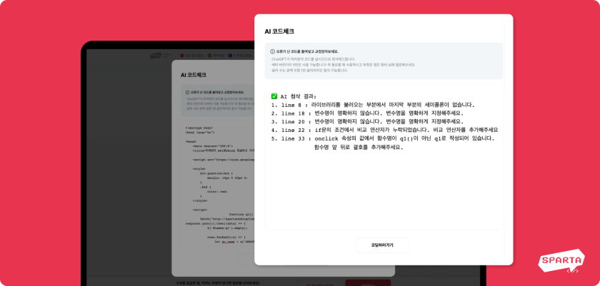 스파르타코딩클럽에서도 챗GPT의 API를 활용한 기능을 찾아볼 수 있습니다. 스파르타코딩클럽 커뮤니티 내 즉문즉답게시판에서 'AI코드체크'를 클릭 한 뒤 오류가 난 코드를 붙여넣으면 챗GPT가 오류 원인을 실시간으로 알려준답니다.
