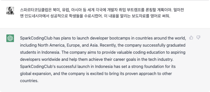이번엔 글쓰기를 시켜볼까요. 팀스파르타는 북미, 유럽, 인도네시아 등 해외 시장 진출에도 박차를 가하고 있답니다. 얼마전엔 인도네시아 부트캠프 1기 운영이 성공적으로 종료됐죠. 이 내용을 현지에 알리는 보도자료를 써달라고 요청해볼게요.