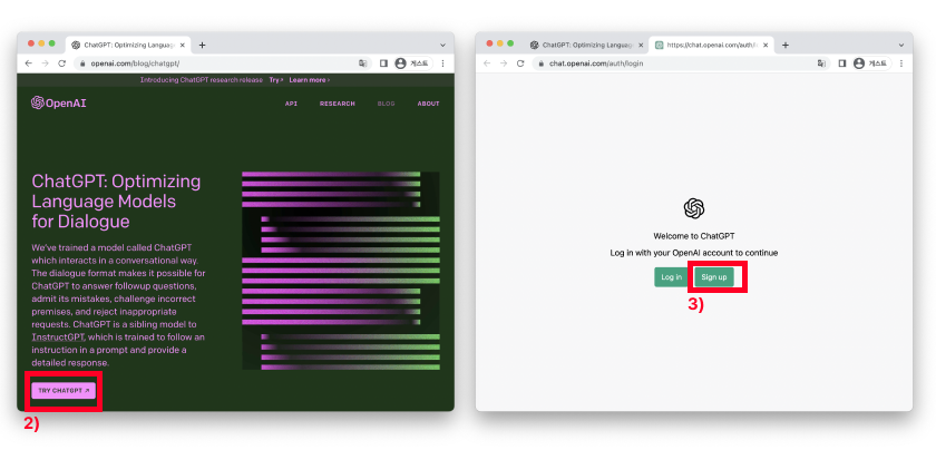 아, 그전에 먼저 회원가입부터 해보겠습니다. 1) Chat-GPT링크로 이동 후, 2)왼쪽 하단의 TRY CHAT-GPT를 클릭해주세요. 3)그 다음 sign up 버튼을 눌러주세요. 구글이나 마이크로소프트 계정으로 로그인할 수 있습니다.
