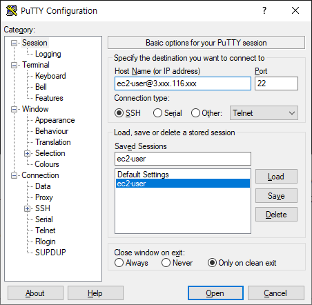 접속 테스트를 위해 ssh 세션 접속 정보와 생성한 keypair 중 비밀키(개인키, private key)를 이용해 접속을 테스트 한다.