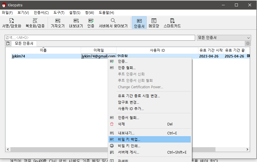 개인키 경우 GnuPG를 다시 설치 시에도 기존 메일 암/복호화 내용을 읽어 볼 수 있게 하기 위해 백업을 해야 한다.