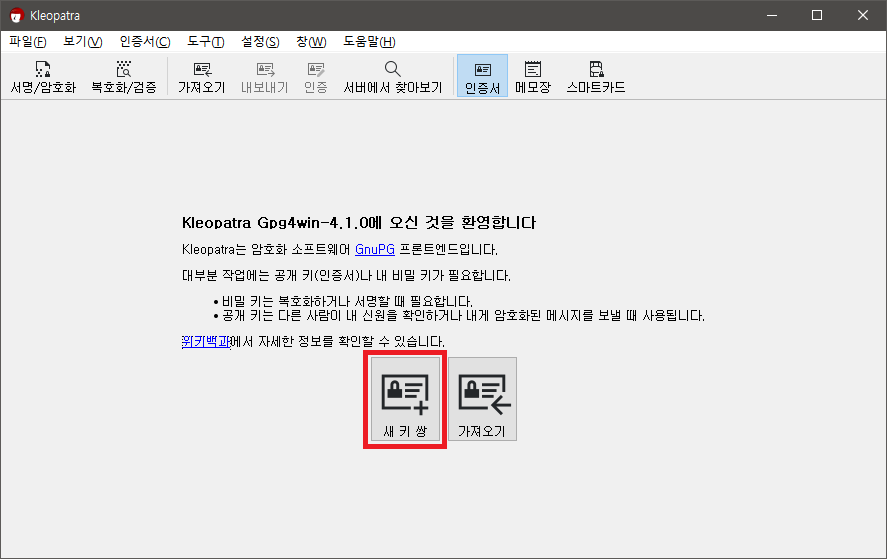 GnuPG를 사용하여 전자서명 및 암/복호화를 하기 위해서는 내 공개키는 내보내기로 파일로 전달 하여야 하고