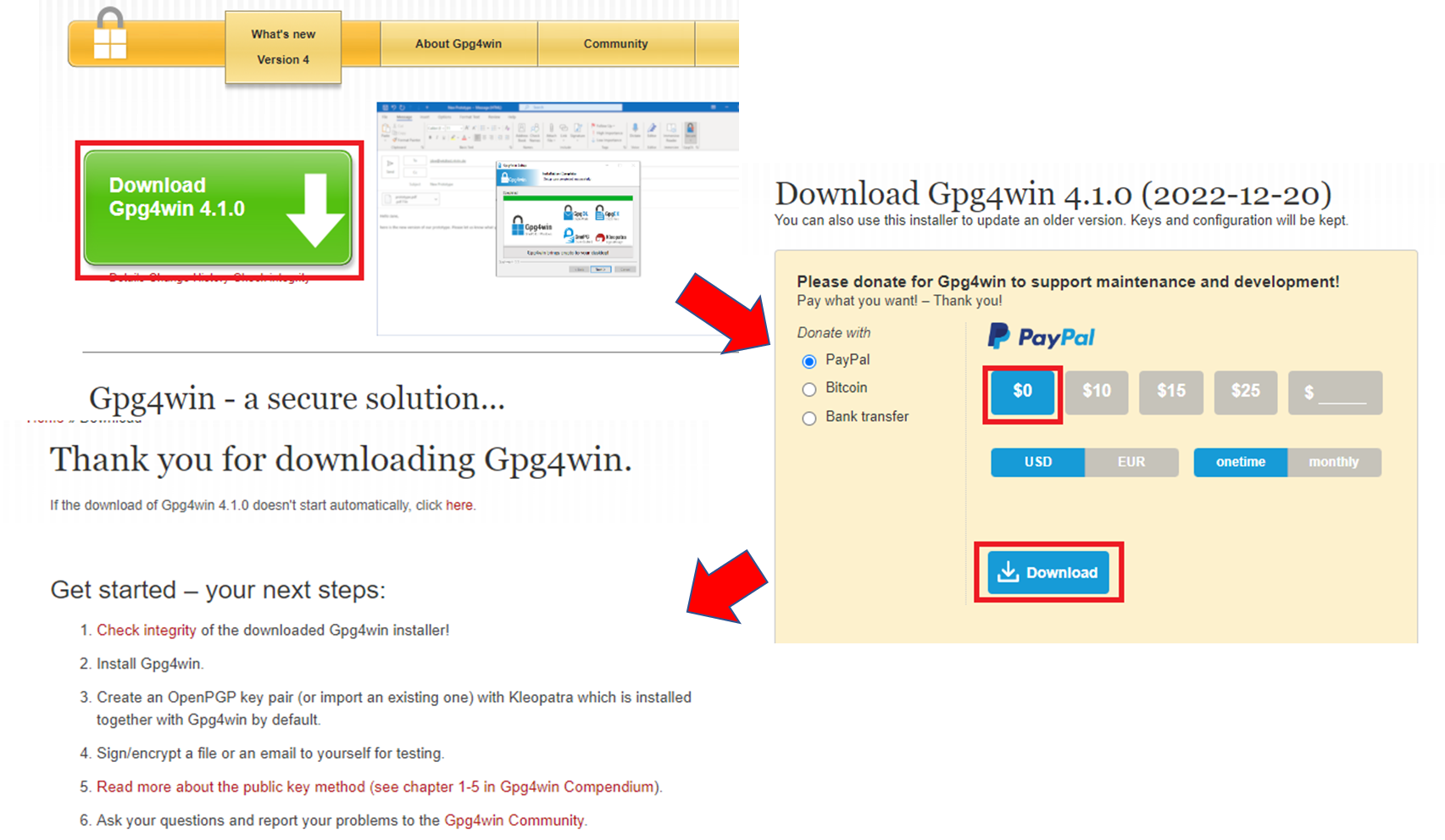 해당 윈도우용 설치 다운로드 및 설치는 https://www.gpg4win.org 사이트에서 그림 처림 진행 한다.
