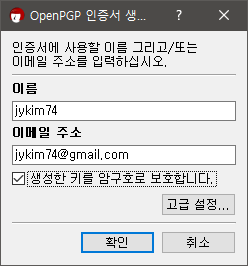 이때 이름이랑 메일 주소 개인키 패스워드를 입력한다.