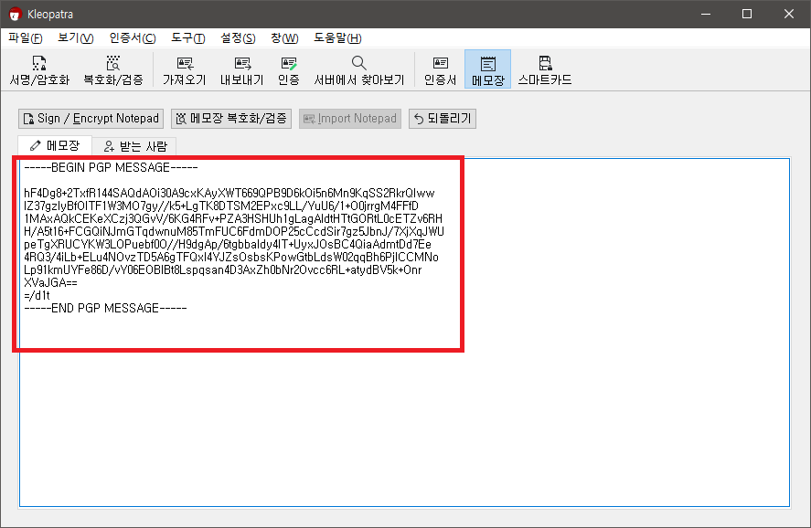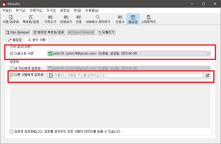 메일 내용을 전자서명과 암/복호화를 하기 위해서는 Kleopatra 의 메모장을 이용하면 된다.