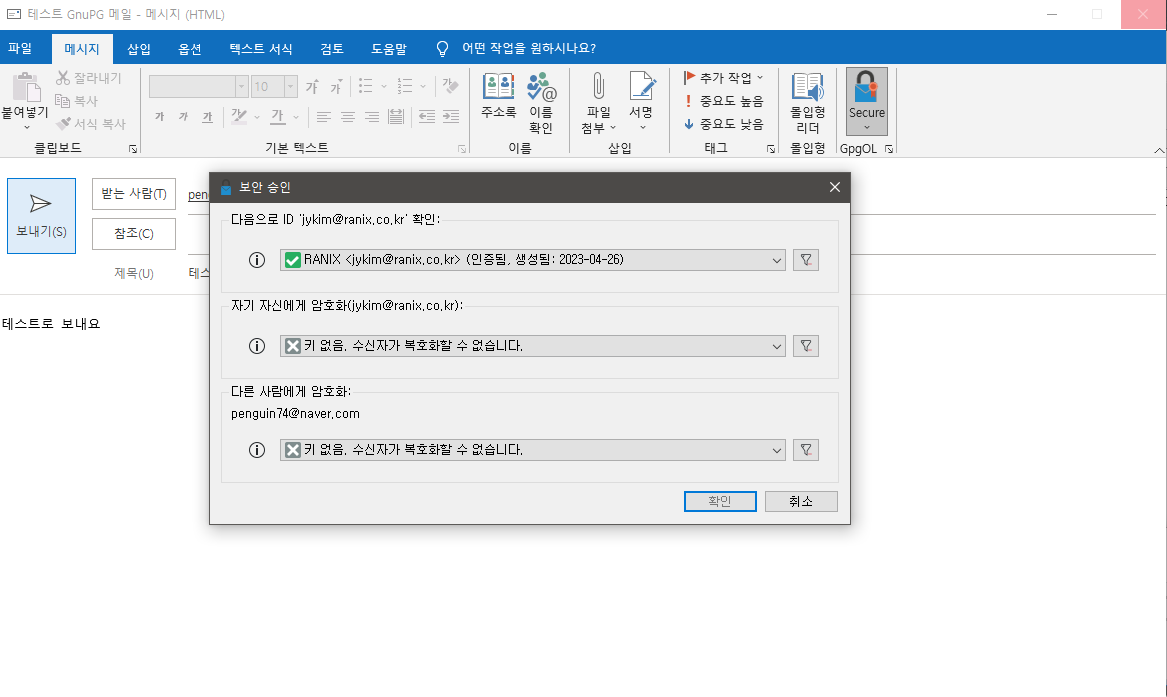 하지만 아래 그림 처럼 GpgOL 이라는 Outlook extension을 통해 아웃룩에서 직접 사용도 가능 하다.