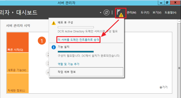 > 관리탭 옆에 깃발을 누르고 "이 서버를 도메인 컨트롤러로 승격"을 클릭한다.