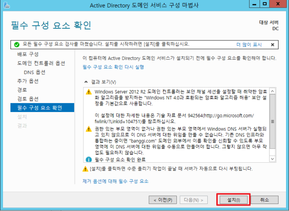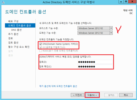 또한, DSRM 암호를 입력하는 란은, 지금의 administrator의 암호가 아니다. 나중에 디렉터리 서비스 복원을 할 관리자의 암호를 입력하는 것이다. 암호까지 입력을 하고 다음을 누른다.