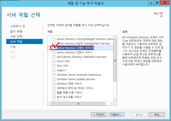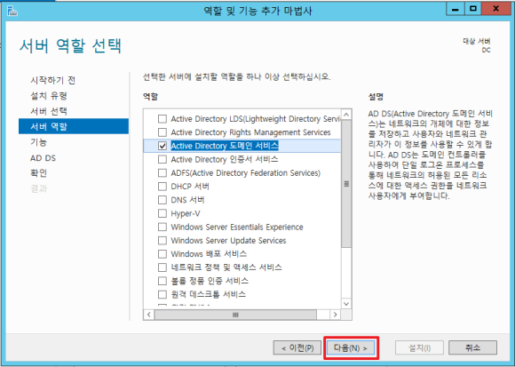 > active directory 도메인 서비스 구성 마법사가 뜨게 되는데,