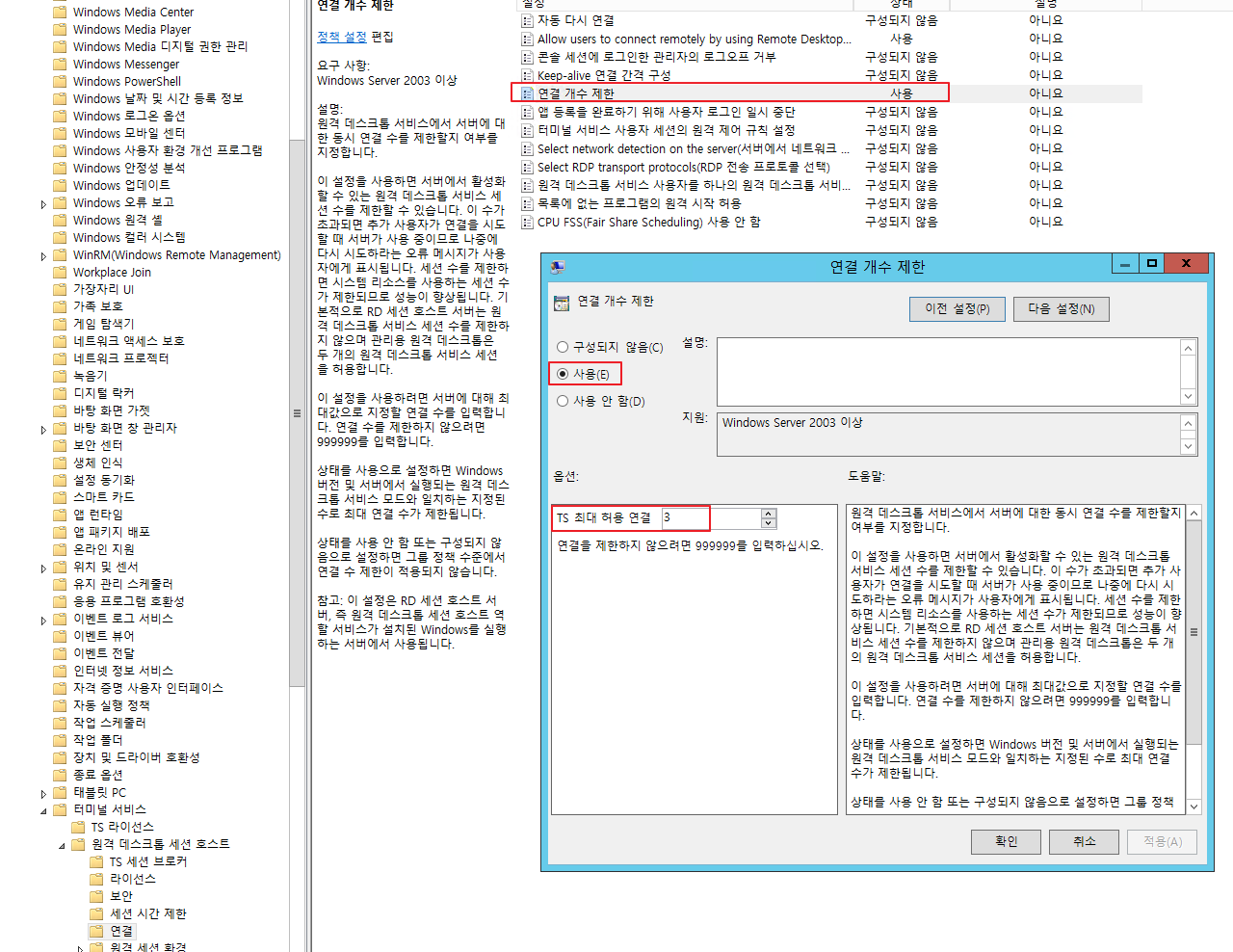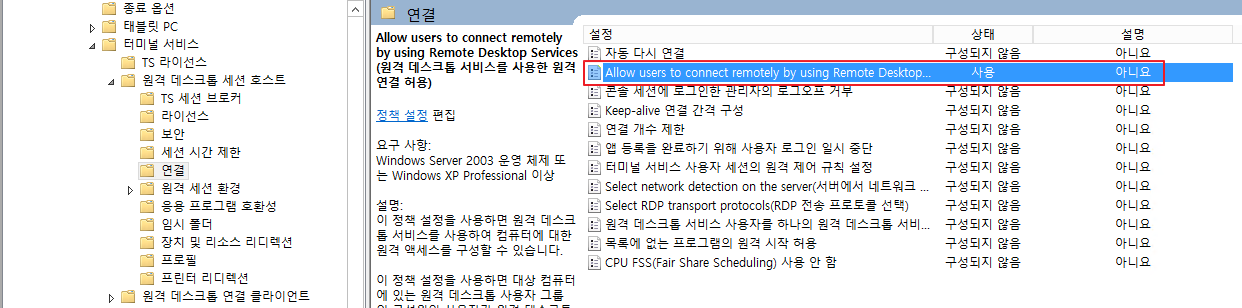 - "컴퓨터 구성" - "정책" - "관리 템플릿" -"Windows 구성 요소" - "터미널 서비스" -"원격 데스크톱 세션 호스트" - "연결" - "Allow users to connect remotely by using Remote Desktop Services(원격 테스크톱 서비스를 사용한 원격 연결 허용)" - 사용 구성