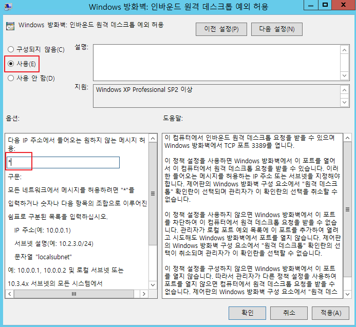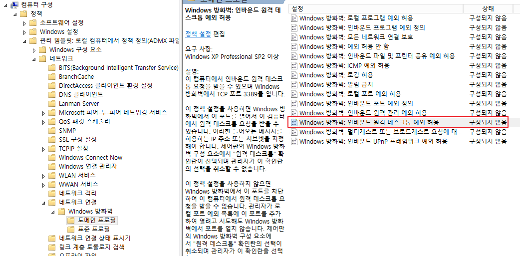 - "컴퓨터 구성" - "정책" - "관리 템플릿" - "네트워크" - "네트워크 연결" - "Windows 방화벽" - "도메인 프로필" - "Windows 방화벽: 인바운드 원격 데스크톱 예외 허용" - 사용 구성