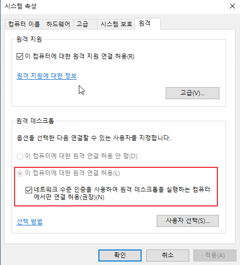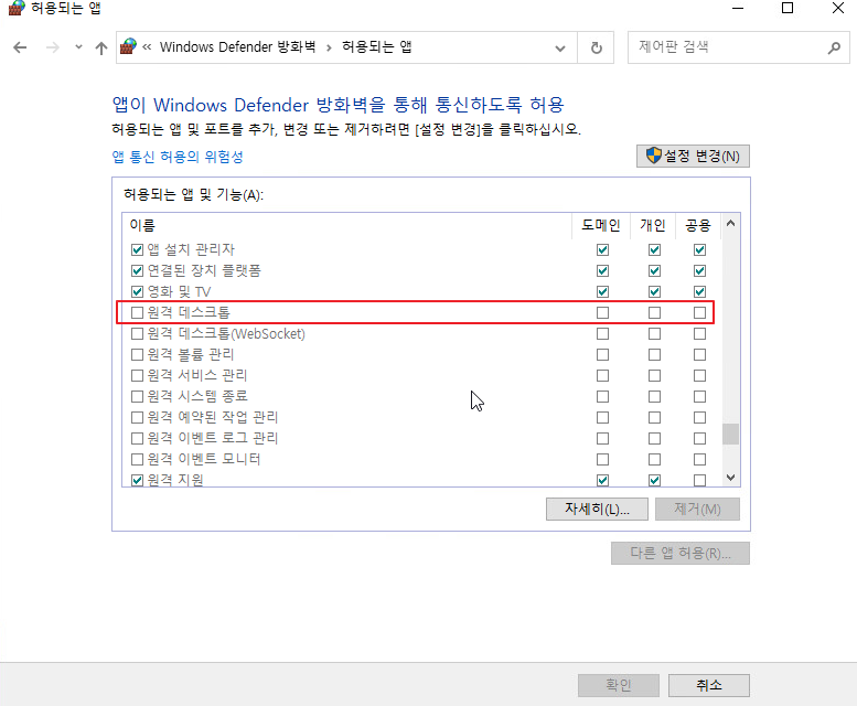 - 원격 데스크톱 설정 및 방화벽 예외 확인
