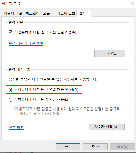2. [AD 맴버] 적용 전 원격데스크톱 설정 - "허용 안함"
