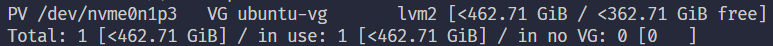 # sudo lvextend -l +100%FREE /dev/ubuntu-vg/ubuntu-lv