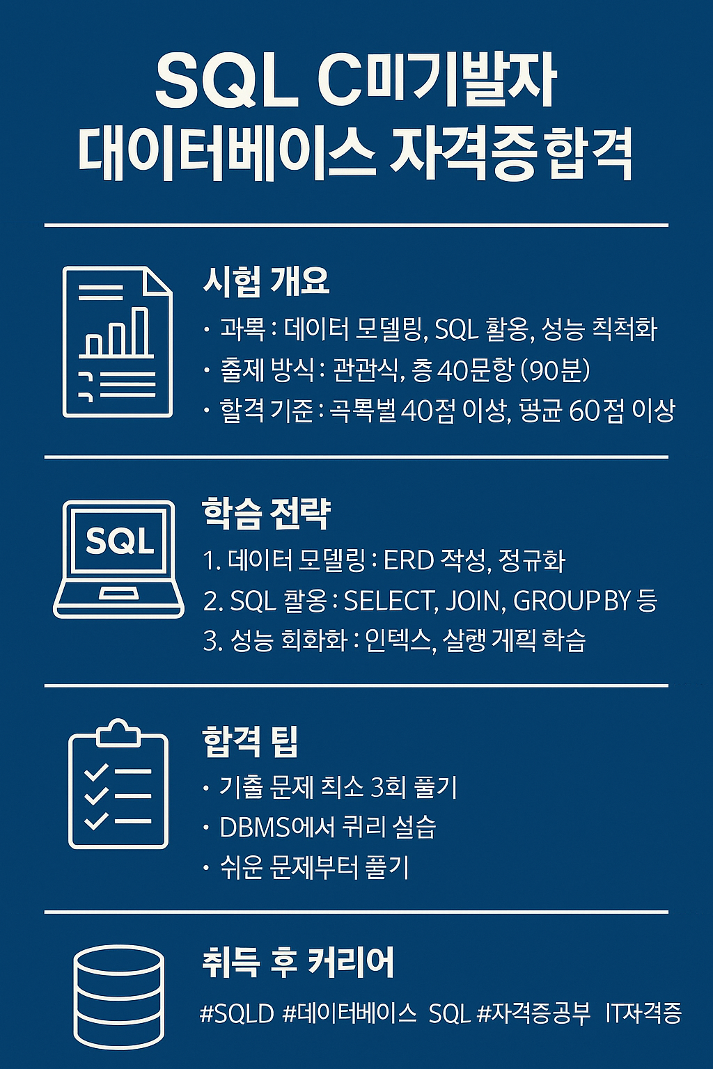 SQLD는 단순 자격증이 아니라 데이터베이스 전문가로 가는 첫 관문입니다. 꾸준한 기출 학습과 실습 훈련이 합격의 핵심입니다.