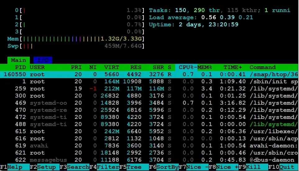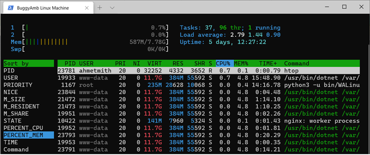 - top 또는 htop : 프로세스별 메모리 점유 확인